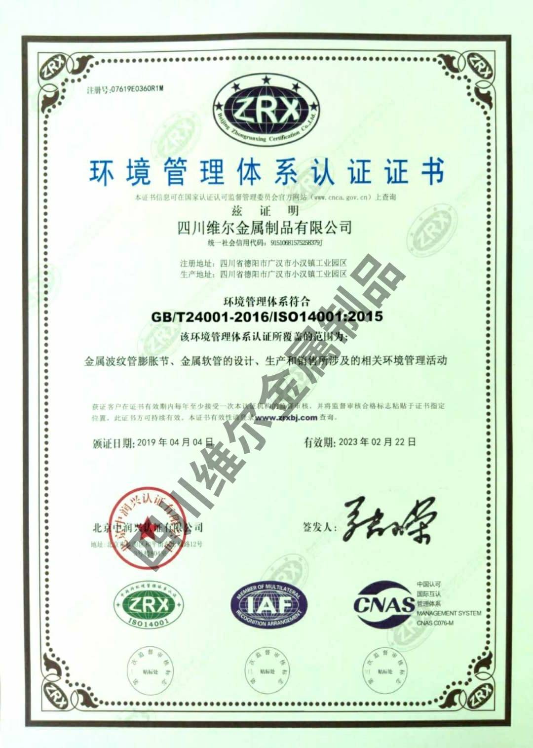 环境管理体系认证证书